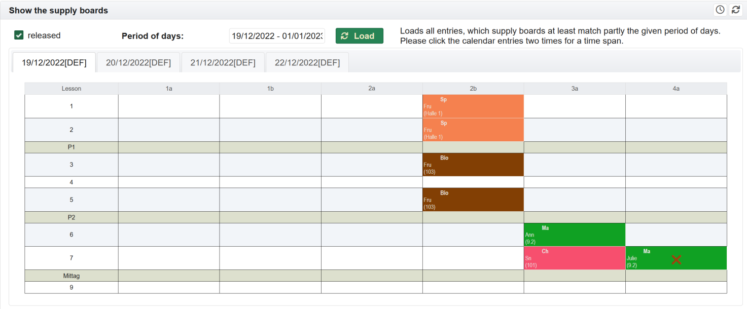 Wenn sich der Vertretungsplan über mehrere Tage erstreckt, wird für jeden Tag ein separater Eintrag mit Datum erzeugt, den man über den Tab auswählen kann.
